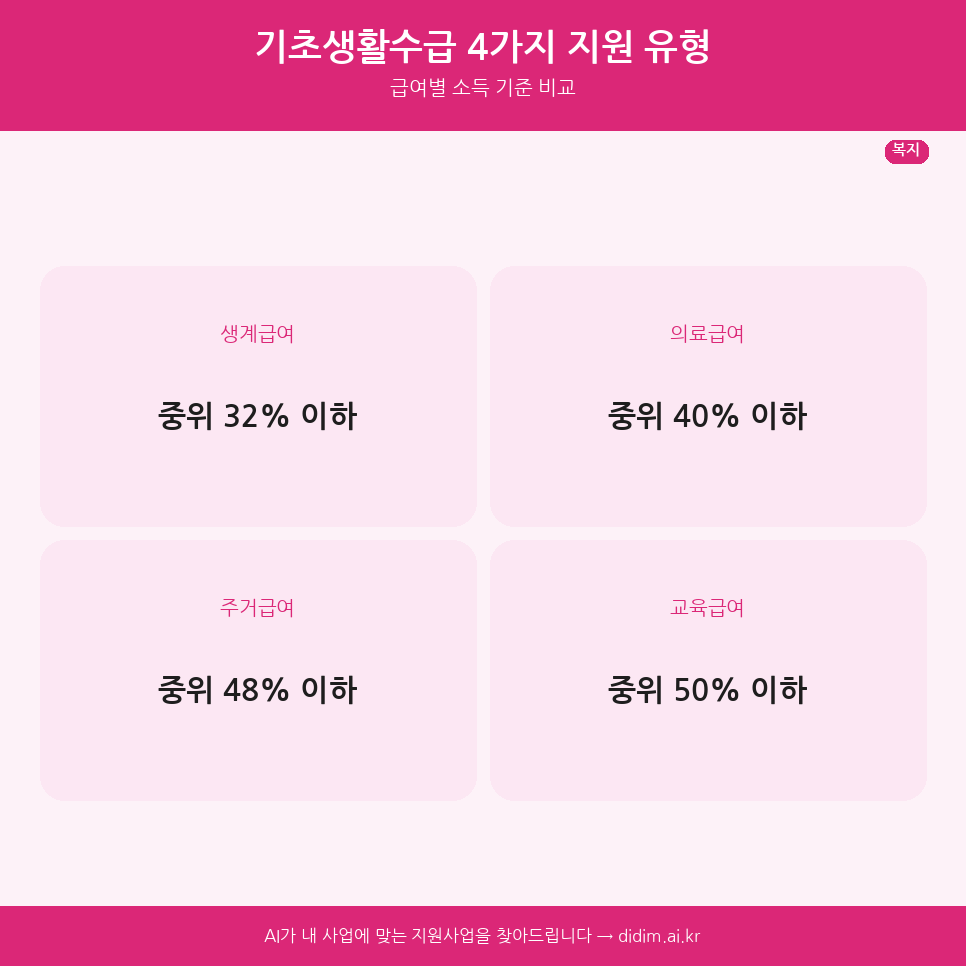 | 항목 | 생계급여 | 의료급여 | 주거급여 | 교육급여 |
