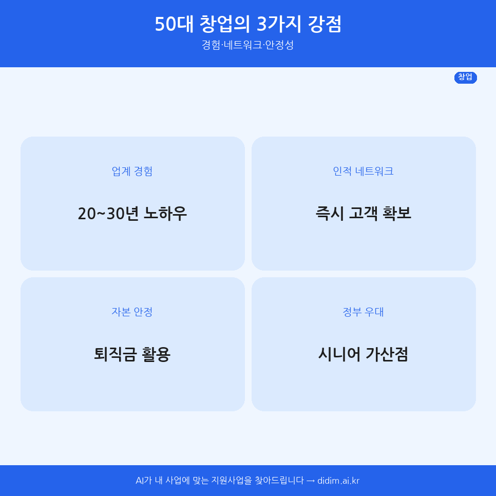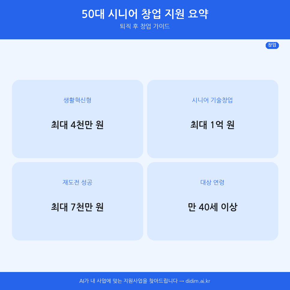 2026년 50대 시니어 창업 지원금 완벽 가이드. 생애재설계, 시니어기술창업, 퇴직자 창업지원으로 최대 1억 원 받는 방법을 한눈에 정리했습니다.