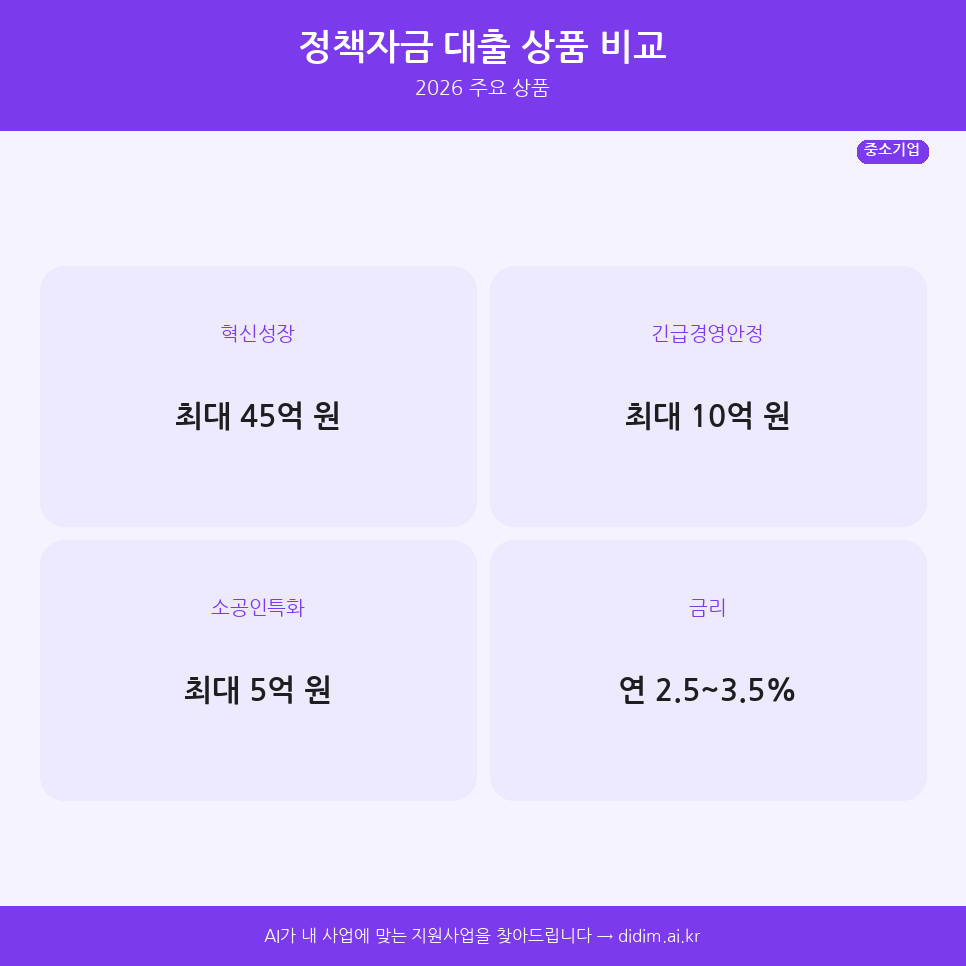 2026년 중소기업 정책자금 대출 완벽 정리. 중진공·기업은행·신보 비교, 금리 3~4.5%, 최대 10억 원까지 신청 가능. 당신의 사업 규모에 맞는 대출 상품 찾아보세요.