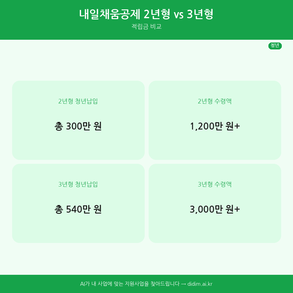 | 청년 납입 | 총 400만 원 (월 약 16.5만) | 총 600만 원 (월 약 16.5만) |